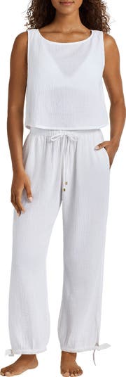 Made of softly textured cotton, this matching set features a boxy sleeveless top and flowy wide-leg pants that make a breezy poolside cover-up option.