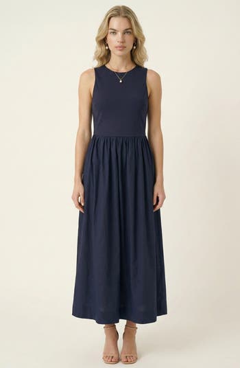 Designed for effortless elegance, this sleeveless midi dress features a classic crew neckline and a gathered waist for a flattering silhouette. The structured bodice transitions into a flowing skirt, creating a timeless and versatile look. Side pockets add a functional touch, making it perfect for both casual and dressy occasions.