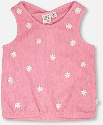 Playful and easy to wear, our crinkle jersey tank top in pink is perfect for warm days. This sleeveless camisole is crafted from soft crinkle jersey with a round neckline, a charming allover daisy print, elasticized hem for comfort, and cross straps at the back for a stylish finish. Pair it with shorts or a skirt from the “Explosion Of Daisies” collection for a breezy summer look.