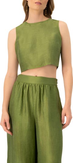 Cropped linen top with a sleeveless design, round neckline, and back closure.