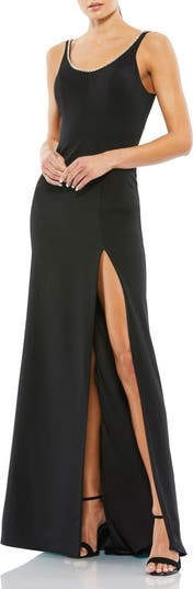 Chic sleeveless column gown with a crystal scoop neckline and high slit, offering a sleek and glamorous look for any formal occasion.