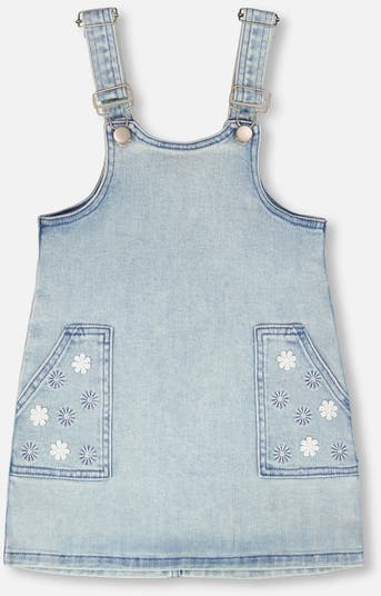 Casual yet chic, our light blue denim overall dress is a versatile piece for playful days. This sleeveless dress features adjustable buckle straps, front patch pockets with embroidered daisies, and a straight cut for effortless layering. Part of the “Explosion of Daisies” collection, it pairs beautifully with any tee or blouse from the line.