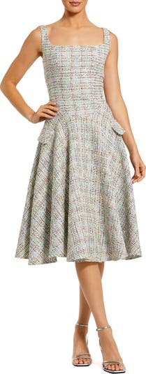 Chic and modern, this bouclé midi dress features a square neckline, drop-waist A-line silhouette, and subtle faux pocket detailing for polished appeal.