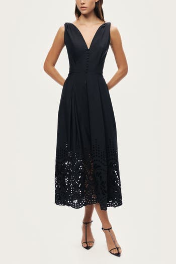 An elegant sleeveless midi dress featuring a sculpted bodice and delicate cutwork embroidery along the hem. Designed to flatter the waist and move effortlessly from day events to evening occasions.