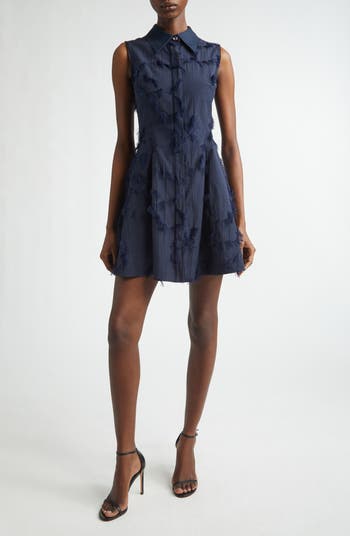 This sleeveless mini brings crisp structure to an airy cotton-enriched fil coupé, letting texture take center stage without feeling heavy. Tonal motifs are finished with a soft fray that adds depth and a quiet sense of motion as you shift through the day.