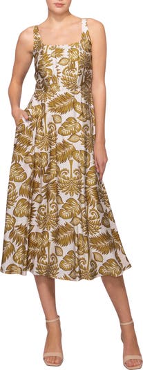 A smocked back shapes the silhouette of this square-neck midi covered in an olive-leaf print and finished with a swingy flared skirt.