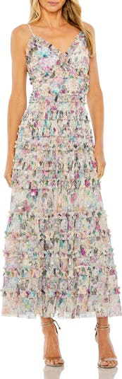 Sleeveless floral maxi dress featuring a flattering V-neckline, delicate sequin details, and tiered ruffle skirt—perfect for daytime events, weddings, and special occasions.
