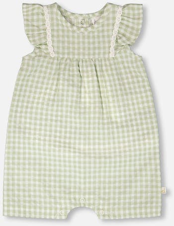 Our baby girl romper in green gingham is a sweet little one-piece for sunny days. This sleeveless design features flutter ruffles at the shoulders, a round neckline, and delicate pleats for extra charm. Finished with bottom snap closures for easy changing, it’s made from soft cotton and polyester with a charming allover gingham print.