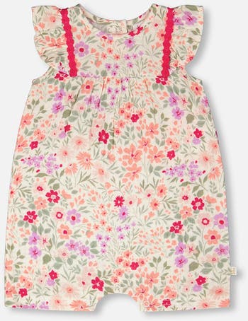 Our baby girl romper off white with printed flowers is a sweet little one-piece for sunny days. This sleeveless design features flutter ruffles at the shoulders, a round neckline, and delicate pleats for extra charm. Finished with bottom snap closures for easy changing, it’s made from soft cotton with a charming allover floral print.