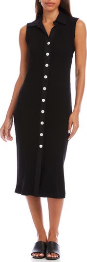 Narrow ribs texture a sleeveless knit midi dress fashioned with a full-button placket and and a sleek column silhouette.
