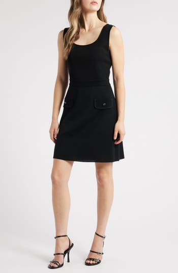 Decorative pocket flaps polish a knit sheath that's easy to style up or down.