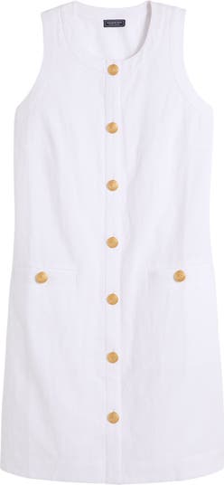 Golden etched buttons elevate this sleeveless shift crafted from a lightweight linen blend.