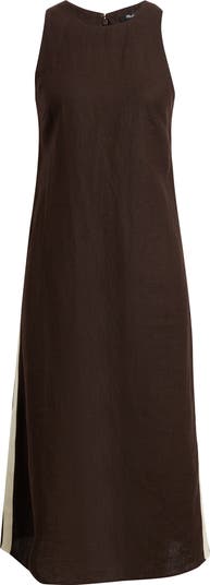 Crafted of 100% linen, this sleeveless maxi dress has a slim fit, jewel neckline and long, flowy skirt with a track stripe along the sides. A dream to dress up or down.