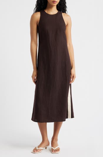 Crafted of 100% linen, this sleeveless maxi dress has a slim fit, jewel neckline and long, flowy skirt with a track stripe along the sides. A dream to dress up or down.