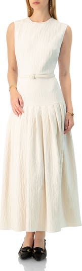 Elegant long dress featuring a round neckline, pleated wide skirt, sleeveless design, and a stylish belt.