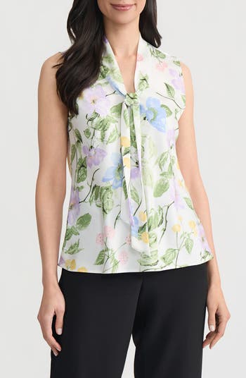 An adjustable pussybow tie drapes from the neck of this sleeveless top made of bias-cut matte satin that's flowy and light.