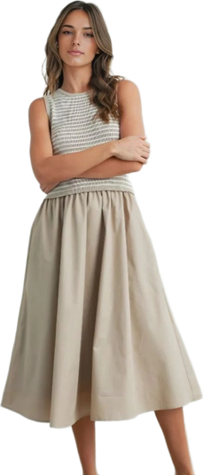 The Knit & Lounge sleeveless beige maxi dress combines a textured knit bodice with a flowing A-line skirt for an effortlessly refined look. Its soft neutral tones and relaxed fit make it perfect for casual outings or brunch dates. Comfortable yet elegant, this dress offers versatile styling options.