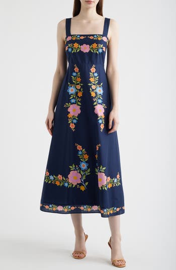 Enchanting blooms romance this sleeveless cotton maxi topped with a fitted square-neck bodice and finished with a perfectly flared skirt.