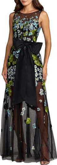 Sleeveless Mesh Applique Gown With Bow Belt