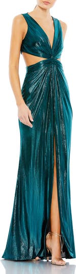 This metallic cut-out gown features striking details and a sleek silhouette, perfect for making a bold statement at any formal event.