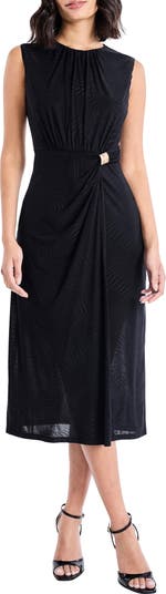A gleaming goldtone piece of hardware shimmers at the waist of this stretch-enhanced midi dress featuring gathers at the neck and a drapey silhouette.