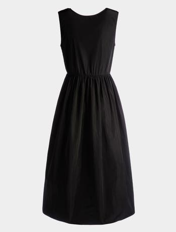 Crafted from lustrous black technical duchesse, this midi dress features a modern design and elegant cut. Gathering at the waist shapes a feminine silhouette.