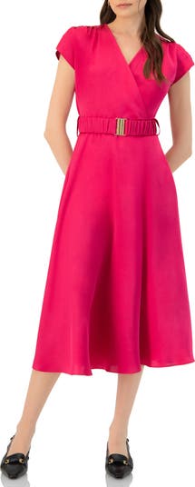 Elegant midi dress featuring a V-neckline, sleeveless design, and a stylish belt for a flattering silhouette.