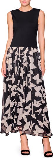 A standout in mixed-media magic, this maxi dress features a dropped waist and a pocket-adorned chiffon skirt that effortlessly blends tailored refinement with free-spirited ease.
