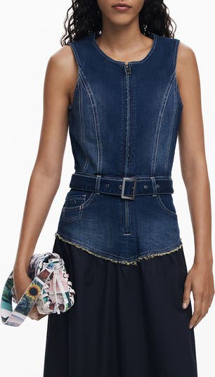 A sleeveless denim top with frayed hem and a pleated cotton-poplin skirt combine to create a smart-casual midi dress that's ideal for rooftop parties and Sunday brunches.
