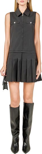 Serve utilitarian flair in this zip-front minidress made with nonfunctional pocket welts at the chest, a dropped waist and a sharply pleated skirt.