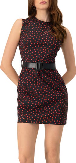 - This short, sleeveless shift dress features a round neckline, playful polka dot print, and a stylish belt.