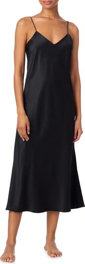 Your bed beckons you in this smooth satin nightgown that's seamed for a graceful curve-skimming fit.