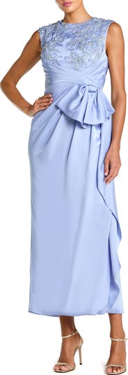 Sleeveless Satin Beaded Ankle Dress With Bow