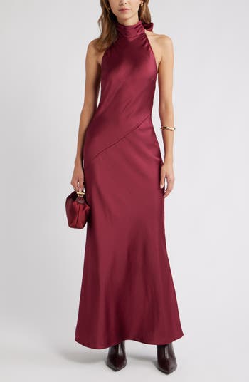 Bring the shine to the party circuit in this shimmery halter dress cut from rich satin that's styled in a long, flowy maxi length.
