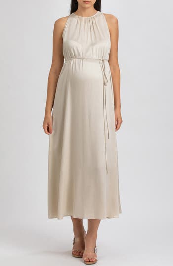 Smooth, lustrous satin skims your figure in this elegant maternity dress, designed with a high neckline and adjustable ties to beautifully accentuate your bump.