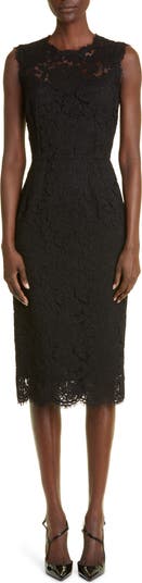 Semisheer lace showcases glimpses of skin on a sultry midi dress designed in a slim-fitting silhouette with a stretch-silk lining.