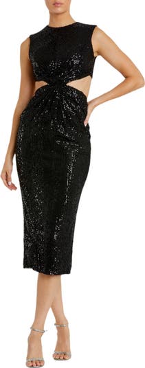 Shine in the Sequin Front Twist Cut-Out Column Dress, featuring a glamorous sequin design and stylish cut-outs for a striking silhouette perfect for any special occasion.
