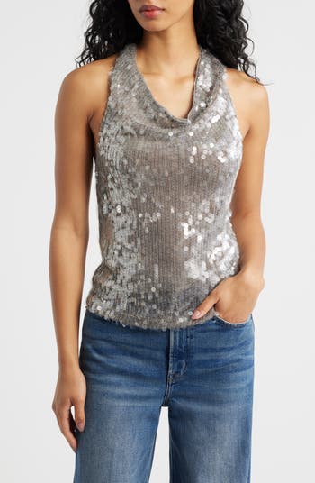 Glimmer throught every party in this sleeveless top designed with allover sequins, draped neck and open back.