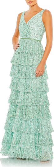 This sequin-embellished mesh gown features a surplice bodice, sleeveless shoulders, a tiered A-line skirt, and a beaded waistband for a dazzling touch.
