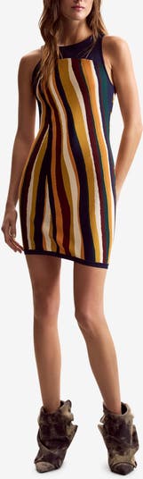 Bold stripes in earthy hues play up the retro vibes of this sleeveless knit minidress.
