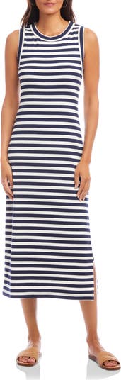 Create a perfectly carefree look with this stretch-jersey midi dress featuring a breezy side slit and crisp, nautical stripes.