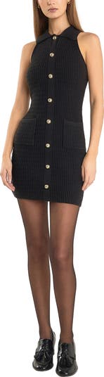 Front patch pockets and gleaming goldtone hardware add subtle finesse to this sleeveless sweater-dress.