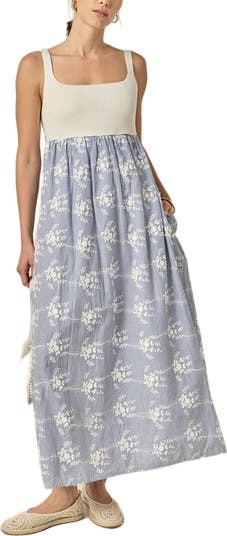 Stitched blooms texture the striped skirt of this sleeveless midi featuring a close-fitting ribbed bodice with a cutout-and-tied back.