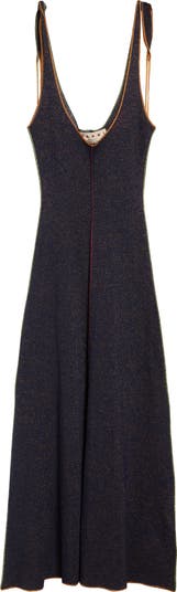This sleek fitted maxi dress is knit from contrast flax and viscose yarns for a mouliné effect and finished with bright contrast-stitched edges. Long straps are knotted at the shoulder, tapering gracefully down the length of the arms for Marni's signature handcrafted aesthetic.