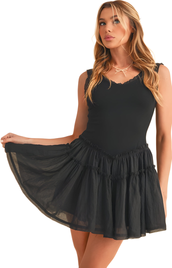 The Knit & Lounge black dress offers timeless allure with its scallop-trim neckline and fitted bodice. The layered tiered skirt flows effortlessly, creating a playful yet elegant silhouette. Perfect for evenings out or casual chic styling, this versatile piece adds sophistication with every wear.