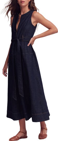 Golden topstiching accentuates the playful fit-and-flare shape of this sleeveless denim dress featuring an exposed zipper at the front and a tie belt at the waist.