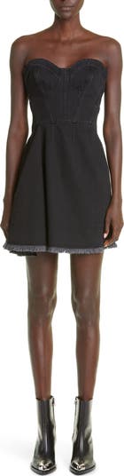 Corset-inspired cups and seams deliver brand-signature structure to a denim minidress edged with a raw hem.