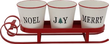 This retro, red sleigh is the perfect way to dress up your holiday table. Three large, tin buckets, printed with Noel, Joy and Merry, offer endless ideas to fill them. Nuts, candies, dried flower arrangements or flameless candles. So many possibilities! Perfect as a centerpiece or displayed on a mantle. Red sleigh with buckets Christmas display Noel, Joy and Merry buckets For indoor use only Overall dimensions: 6.75"H x 18.75"W x 5.25"D Buckets: 4.75" high x 5.5" in diameter Bottom: 3.75" diameter Material(s): metal