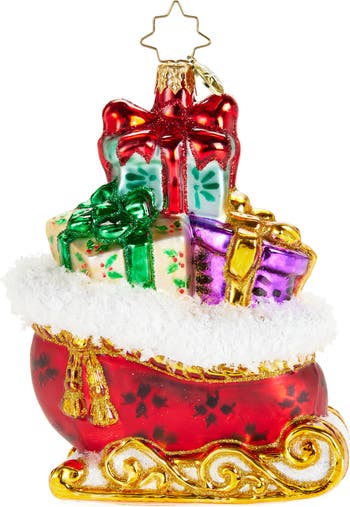 Made from mouth-blown, hand-painted glass, this glitter-dusted sleigh piled high with toys is an heirloom-quality ornament worthy of collecting or gifting.