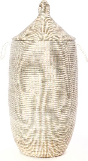 This Slender Laurel Hamper Basket from Senegal is an elegant, tall storage piece with clean lines and a refined presence that complements both modern and classic interiors. Handcrafted by skilled weavers in Senegal using traditional coiling techniques, it blends natural cattail reeds with salvaged plastic cord for a strong yet lightweight weave. Its slender silhouette makes it a graceful addition to corners and narrow spaces, ideal where both style and storage matter. Perfect for containing laundry, towels, linens, or everyday essentials, this hamper keeps rooms looking neat while still feeling warm and inviting. Its understated design allows it to blend seamlessly into bedrooms, bathrooms, or laundry areas, and its generous capacity handles everyday clutter with ease. Whether placed as a functional storage solution or a subtle décor accent, this artisan-made basket brings thoughtful craftsmanship and everyday calm to your home
